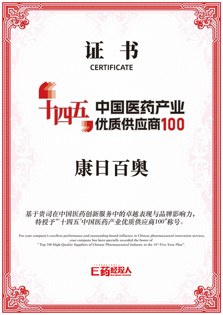 凭借在中国医药创新服务领域中的卓越表现,康日百奥Bioworkshops 荣登“‘十四五’中国医药产业优质供应商100”榜单。