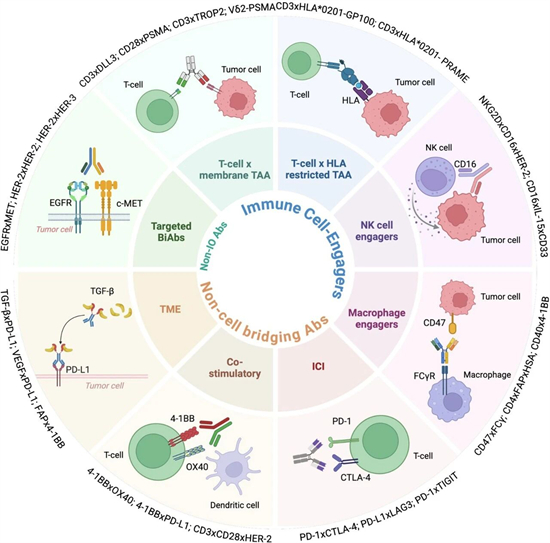 在非细胞桥接疗法中,双特异性抗体主要通过调控免疫检查点、共刺激信号及肿瘤微环境来增强抗肿瘤免疫。例如,靶向PD-1/CTLA-4等双重免疫检查点抑制剂可产生协同激活效应,帮助克服耐药机制[7]。而共刺激受体激动剂(如OX40/4-1BB)能够提供T细胞完全激活所需的信号2,但存在系统性免疫过度激活的风险[8] 。因此,这一疗法更倾向于采用肿瘤相关抗原限制性组合(如TAA/CD28、TAA/4-1BB)来实现可控的免疫激活[9][10]。